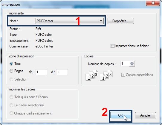 l'imprimante "PDFCreator" comme ci-dessous, et cliquez sur le bouton "OK" :